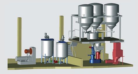 通過投料系統(tǒng)、上料系統(tǒng)、稱重系統(tǒng)、漿料輸送系統(tǒng)、過濾系統(tǒng)、除磁系統(tǒng)、預混系統(tǒng)、均質系統(tǒng)、研磨系統(tǒng)、儲存系統(tǒng)、罐裝系統(tǒng)等組成濕法研磨生產線。
